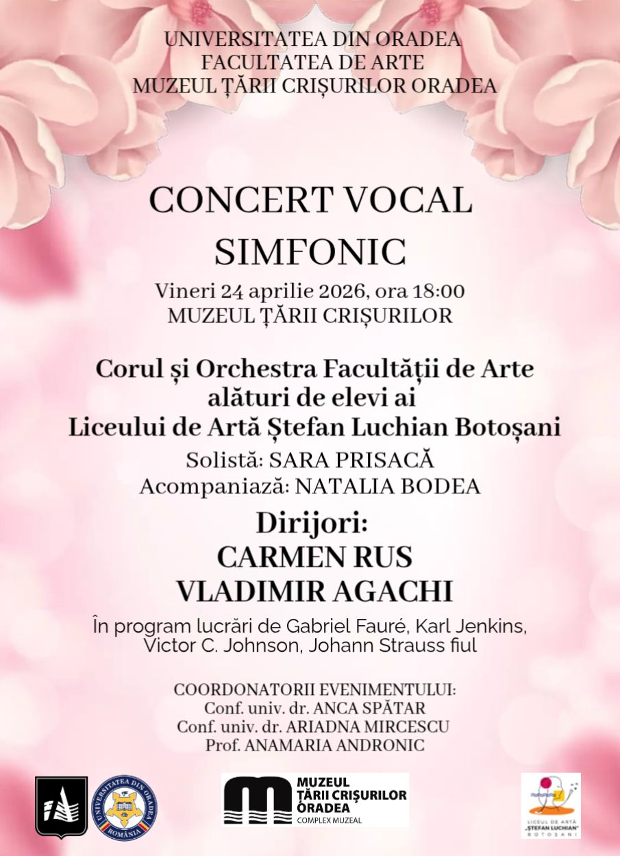 Vineri 24 aprilie 2026 de la ora 18:00, Muzeul Țării Crișurilor va găzdui concertul final al atelierelor de ansamblu coral și orchestră desfășurate la Casa Muzicii. Proiectul reunește studenți ai Departamentului Muzică al Facultății de Arte cu elevi ai Liceului de Artă Ștefan Luchian din Botoșani care, timp de o săptămână, vor colabora la interpretarea unor lucrări de Gabriel Fauré, Karl Jenkins, Victor C. Johnson și Johann Strauss fiul. Intrarea este liberă în limita locurilor disponibile.