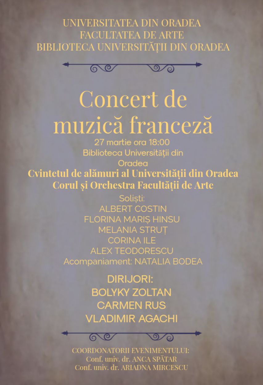 Vineri, 27.03.2026, începând cu ora 18:00, Holul Bibliotecii Universității din Oradea va găzdui Concertul de Muzică Franceză care îi va avea ca protagoniști pe studenții Departamentului de Muzică-Facultatea de Arte, Universitatea din Oradea. Evenimentul încheie masterclassul organizat de Departamentul de Muzică din cadrul Facultății de Arte. Timp de o săptămână studenții au avut oportunitatea de a lucra cu dirijorul Bolyky Zoltán, profesor al Facultății de Muzică de la Universitatea din Debrecen, invitat de instituția orădeană prin programul Erasmus. Masterclass-ul a oferit experiențe noi atât studenților cât și colegilor profesori și a fost un schimb de experiență reușit, benefic pentru toți cei implicați. Intrarea este liberă.